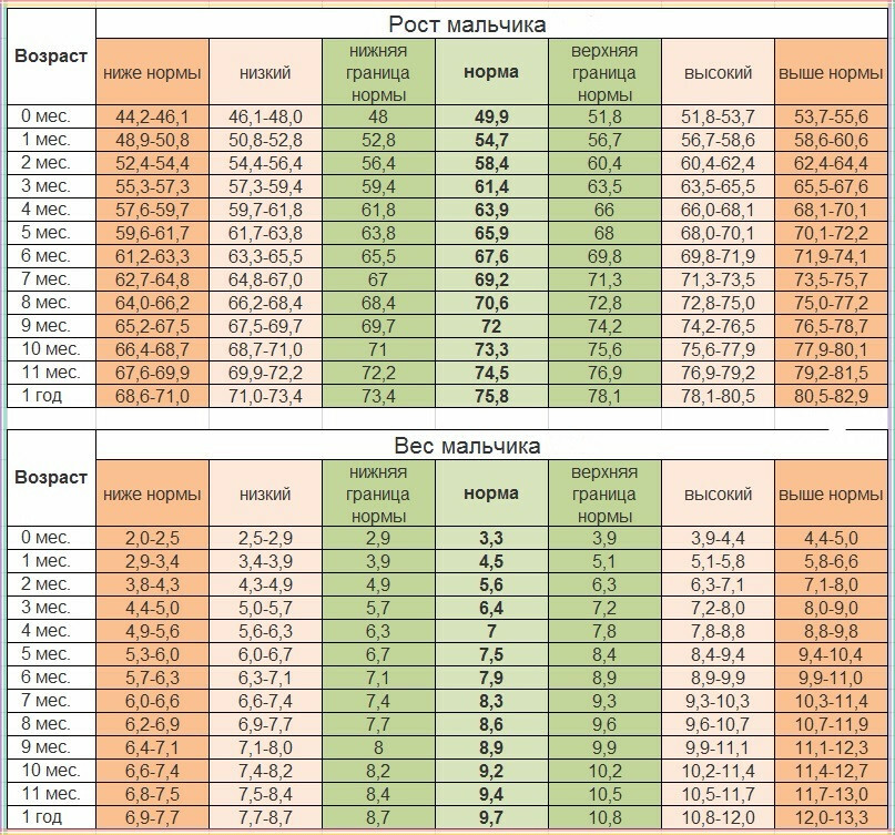 Ориентироваться можно по таблицам ВОЗ, в которых представлен рост и вес мальчиков и девочек первого года жизни. Эти таблицы показывают не только абсолютные значения роста и веса малышей, но и их взаимосвязь. Пользоваться ими удобно и просто.